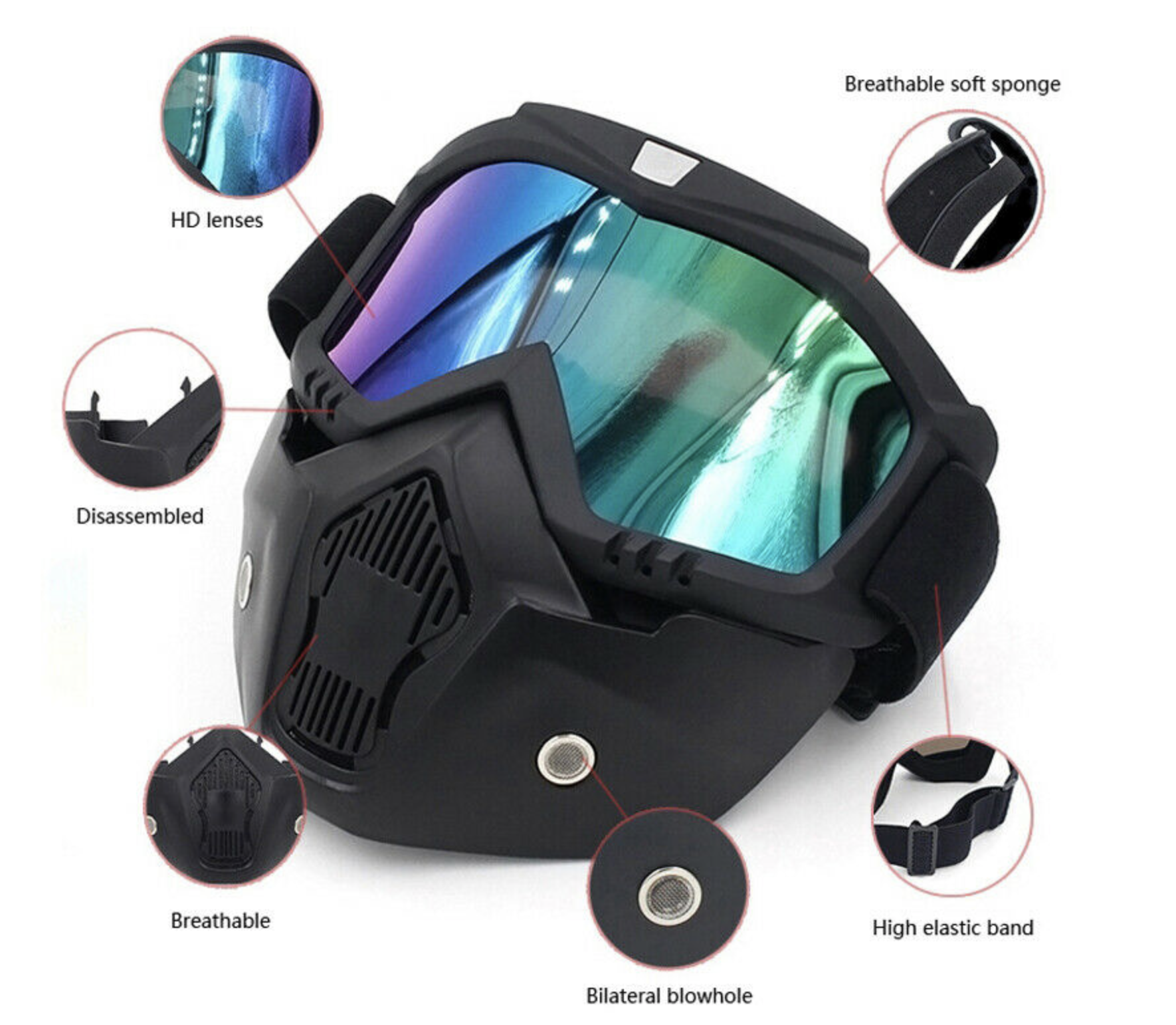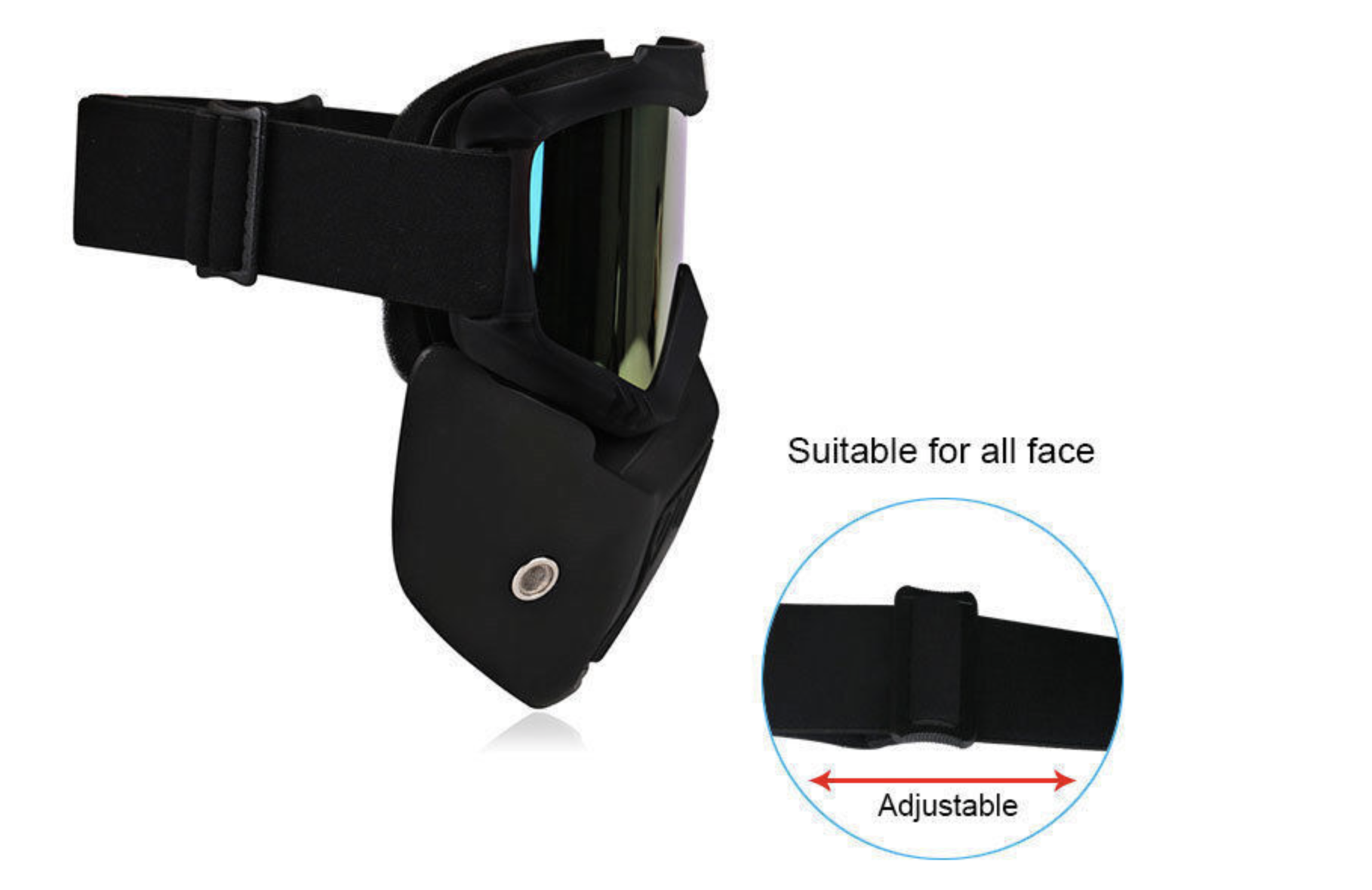 Stylish goggles with detachable mask, so the goggles can be used alone. and the mask with slot and the goggles with slot hole which is easy to install and dismantle. Windproof goggles is flexible and practical, suitable for most outdoor sports. High-density sponge has as great exhaust ventilation for a comfortably wearing. Breathable mouth filter and holes provide better air permeability. High elastic band, which can freely adjust the length. The non-slip strap fits any size of head, providing a comfortable wearing experience and well protection. Our lens is made of PC which has strong physical properties. It can not only prevent the cold wind on the eye irritation but also prevent UV rays from burning on the eyes. For outdoor sport, such as motorcycling, motocross, scooter, riding, snowmobile, labortatory, cycling, skiing, and riding. Or costume ball, halloween party and movie props.