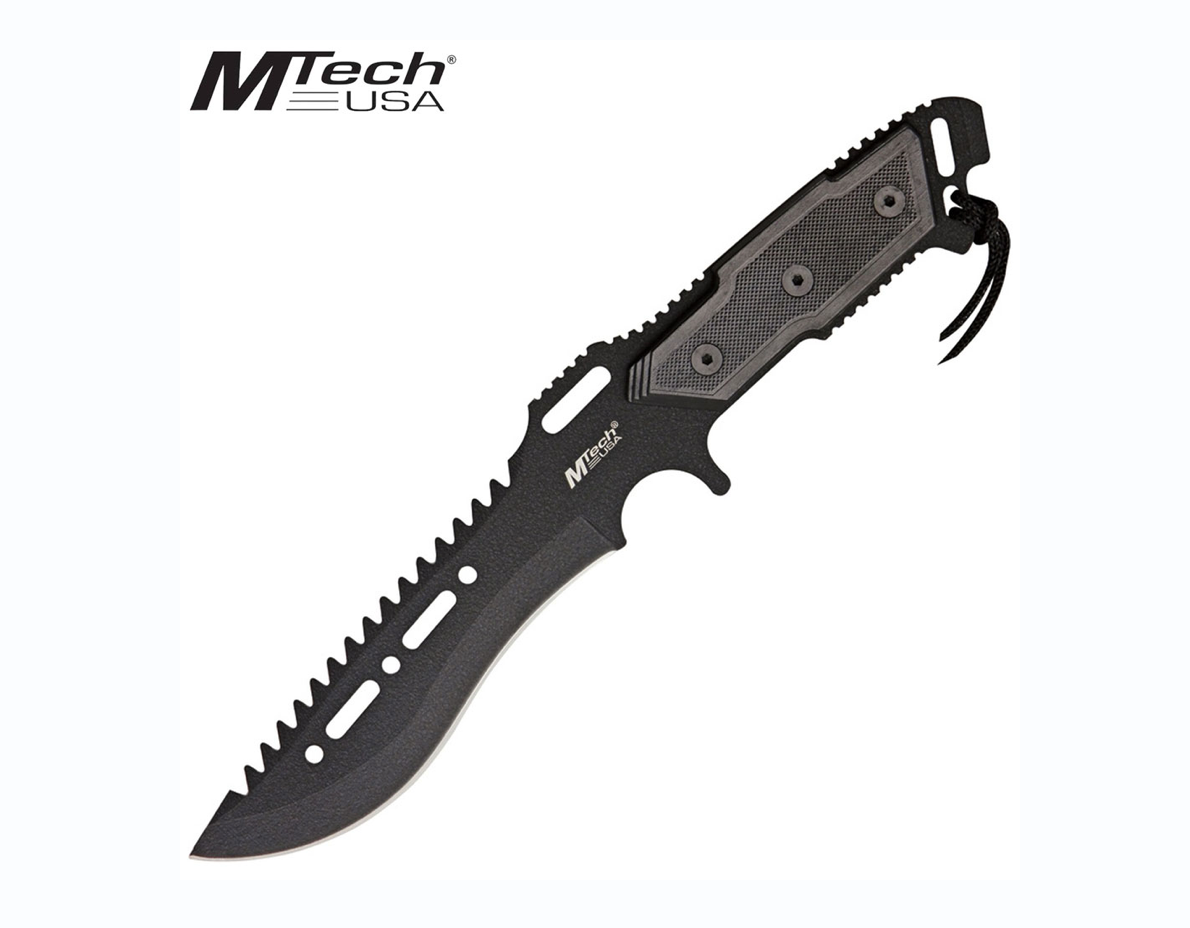 the MTech Combat Tactical Sawback Knife is made with a full tang stainless steel black coated blade with a black textured synthetic handle.